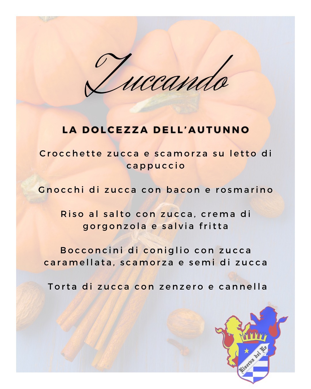 Nel Menù che segue possono essere presenti prodotti Allergeni: Glutine, Uova, Arachidi, Latte, Soia, Frutta Secca, Sedano, Senape, Sesamo, Frutta a guscio, Anidrite Solforosa, Lupini, Molluschi, Pesce, Crostacei.